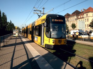 Am 1.7.2006 konnte ich die Casino-Bahn am Albert-Wolf-Platz als Linie 1 fotografieren, da wegen Abbau der Bauweiche am Abzweig nach Reick nach Prohlis fuhr. |