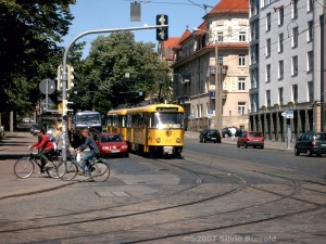 Eine blaue Bahn im Grünen Wald von der Gelben Firma. |