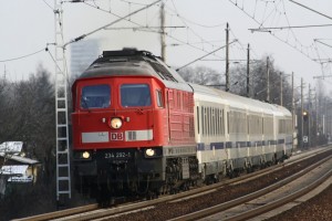 BR234 vor dem Berlin-Warschau-Express. Meistens wird der Berlin-Warschau-Express mit der Skoda-Mehrsystem E-Lok bedient. Warum teilweise eine Diesellok zum Einsatz kommt, weiß ich leider nicht. |