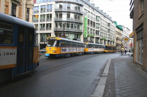 Die Bahn hat gerade die Endstelle Wahren verlassen. Nächste Haltestelle ist Annaberger Straße. |