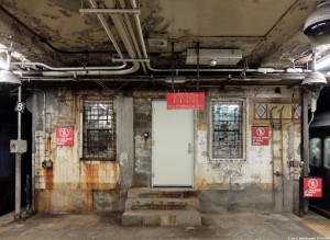 Die Ecke des verbliebenen Seitenbahnsteigs - wo verfallene Wanddekoration auf nach 1960 installierte technische Einrichtungen trifft, die ebenfalls mittlerweile verfallen sind. |