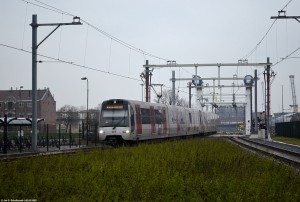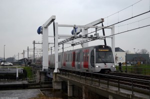 Rückfahrt in Richtung Ommoord. Diese Brücke wurde bis 1992 neu errichtet - zuvor gab es hier eine Drehbrücke, die durch einen Unfall 1980 etwas bekannter wurde. Damals war die Drehbrücke nicht komplett geschlossen, was zur Entgleisung eines SGM führte, der von der Brücke stürzte und nur von mehreren Oberleitungsmasten, auf die er fiel, davon abgehalten wurde, ins Wasser zu fallen. |