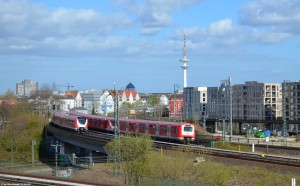 zwischen zwei Generationen S-Bahn um die Einfahrt in den Altonaer Tiefbahnhof. 258+238 als S11 nach Blankenese, 9129+9118+der nicht im Bild sichtbare 9113 als S3 nach Stade. Hinten im Bild quert die nach Westen abzweigende Strecke nach Bahrenfeld, die der 472-Vollzug gleich befahren wird. |