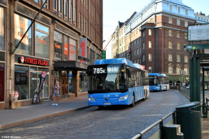 Der KOM 1606 befährt am 28.06.2022 als Linie 23 nach Britas die Straße Kaisaniemenkatu und passiert die gleichnamige Straßenbahnhaltestelle. |