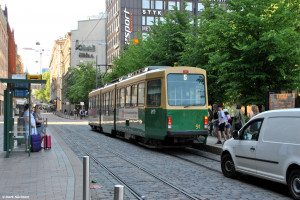 Auch in Helsinki gibt es diverse Fahrzeuge mit Vollwerbung. Der Valmet-Wagen 96 wirbt f眉r American Express und ist am 28.06.2022 auf der Linie 7 nach L盲nsiterminaali unterwegs. |