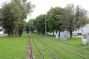 Blick von Peuerbachstraße in Richtung Linke Brückenstraße am stadtauswärtigen Gleis im August 2025. An dieser Stelle wird sich später die Tunneleinfahrt in Richtung Linke Brückenstraße befinden. |