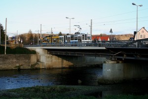 bei der Einfahrt in die Haltestelle Fußgängerbrücke. Im Hintergrund ist der Stadtteil Zwötzen zu sehen, welcher noch von der Abendsonne angestrahlt wird. Nach links geht es mit der Linie 3 nach Bieblach-Ost. |