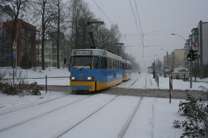 bei stärkerem Schneefall Begegnung an der Haltestelle Parkstraße |