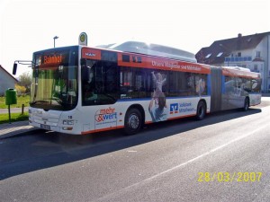 Einer der Erdgas-Lions City als Linie 10 am Bahnhof in Gießen. |