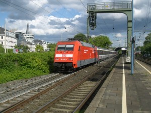 101 099-0 schiebt hier den EC102 gaerade am Mehlemer Bahnsteig vorbei.