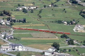 RhB - Regionalzug 464 von Tirano nach St.Moritz am 29.08.1993 in der Kehre oberhalb Brusio mit Triebwagen ABe 4/4 II 49 + ABe 4/4 II 42 - 2x B - BD - 4x B. Hinweis: Wunderschön ist die serpentinenartige Linienentwicklung der Berninabahn mit 70 Promille Steigung oberhalb des Bahnhofes zu erkennbar, gescanntes Dia. |