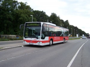 Als 2-stündlicher SEV (teilw. fährt auch noch die BOB) aus Ravensburg zur Weiterfahrt nach Aulendorf, hier in der Lerchenfeld-Siedlung, kurz vor der Bushaltestelle. |