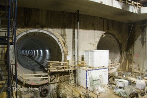 Hinter dieser Wand wird der Tunnel auf 100 Meter Länge im Druckluftverfahren vorangetrieben. Bauzeit dafür: 1 Jahr. Das Erdreich kann hier nur mit kleinen Elektro-Baggern ausgehoben werden, das dauert doch was länger als bei einer Tunnelbohrmaschine.