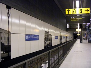 Typische Bahnsteigarchitektur auf der U7-West: Webung, Graffiti, 90er-Jahre-Formen. |