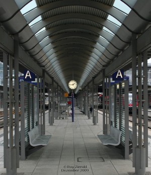 Der verschneite Mainzer Hauptbahnhof, aufgenommen von der Alicenbrücke am 18.12.2009 |