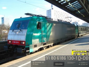 186 130-1 mit einem Spezialzug "EURO DB" MME 75002/75003 von Berlin Hauptbahnhof nach Gdansk Glowny. Bromberg Hauptbahnhof. |