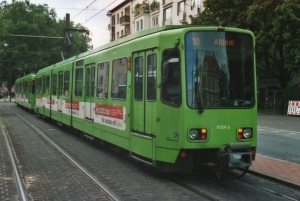 Im September 2006 nahm die Üstra an einer Veranstaltung gegen Rechts teil, wozu 6 Tw 6000 mit einer Werbung mit den Parolen "Bunt statt Braun" beklebt wurden und in 3 Doppeltraktionen auf der Linie 10 eingesetzt wurden. Das Bild zeigt den Tw 6138 auf der Fahrt nach Ahlem am Clevertor. |