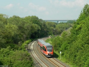 zwischen Haltepunkt Ahrweiler Markt und Überleitstelle Walporzheim am 31.05.2014. Am Hang des Berges ist Haus Hohenzollern zu sehen.