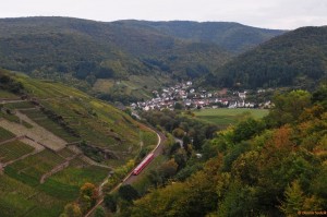 hier zu sehen das alte Bahnhofsgebäude, welches in einem sehr gut gepflegten und renoviertem Zustand vor sich her erstrahlt! Im Mittelgrund ein kleines Panorama über das Dorf Mayschoß. Im Hintergrund die für diese Gegend typischen Weinberge.