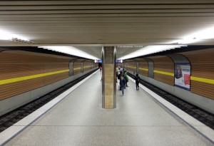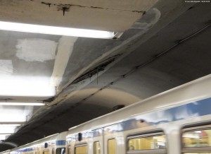 Dieser U-Bahnhof wurde 1978 in den bestehenden Tunnel eingefügt, nachdem eine zuvor im Weg stehende Autobahnplanung verworfen wurde und zeigt sich 2016 in einem irre sanierungsbedürftigen Zustand. An den Deckenschiffen scheint immerhin gearbeitet zu werden - aber bei den Decken im Gleisbereich sieht das nicht so aus. |