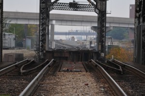 Eine Besonderheit im Chicagoer Schienennetz stellen die unzähligen beweglichen Brücken dar, welche die Gleistrasse zum passieren von Schiffen unterbrechen. Im Bild sieht man eine sehr alte Brücke, welche die Gleise samt Brücke vertikal nach oben ziehen kann. Momentan ist die Brücke oben.