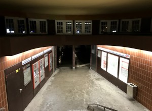 An diesem Bahnsteig wäre, so die alte Planung die U4 aus Richtung Innenstadt angekommen. Im Gleisbett rechts wäre sie dorthin zurückgefahren. Hinten sieht man deutlich den Schlenker, den die U1 heute fahren muss, um die eigentlich geplante Gleislage zu erreichen und gleichzeitig die baulich vorbereitete U4-Tunnelrampe, die in einem Erdhaufen endet, zu umfahren. |