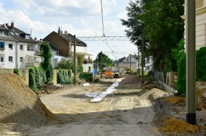 Blick Richtung Brühl Mitte vom Bahnübergang Clemens-August-Straße am 22.07.2017 (links das Wendegleis Brühl Mitte und rechts noch der eingleisige Streckenabschnitt Richtung Brühl Süd). |