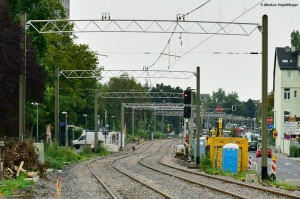Der ehemalige eingleisige Abschnitt zwischen den Haltepunkten Brühl Süd und Brühl Mitte aufgenommen vom Bahnübergang Liblarer Straße am 26.08.2017 (Blickrichtung Brühl Mitte). |