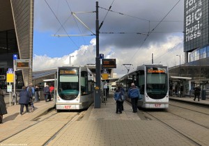Die Linie 8 unterwegs nach Spangen. Alle Bahnsteige am Hauptbahnhof sind als Doppelhaltestellen ausgeführt, wobei Züge dort auch zweimal halten, sobald die Platz zum Vorziehen haben. |