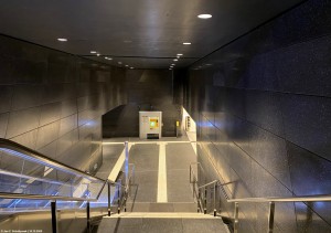 In der Verteilerebene gibt es auf beiden Seiten ein Panoramafenster zu den Bahnsteigen. Leider nicht ganz blendfrei. |